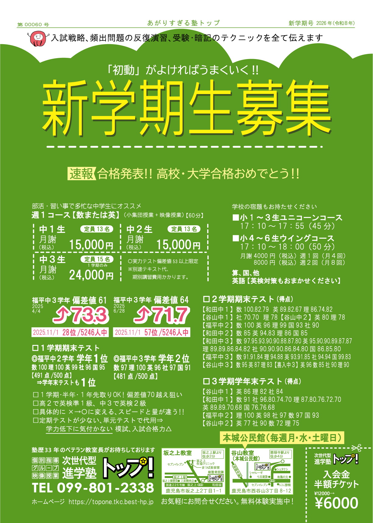 | 所在地 | ●坂之上教室 鹿児島市坂之上2丁目1-1 JR坂之上駅より徒歩2分 樹整骨院隣 ●谷山教室(本城公民館) 鹿児島市西谷山3丁目8-12 JR慈眼寺駅より徒歩4分 |